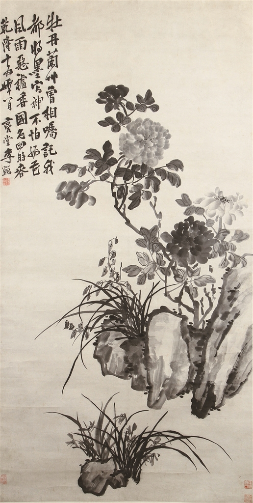 《牡丹兰石图》轴(见图),纸本设色,长140.5、宽71厘米,徐州博物馆藏文物。《牡丹兰石图》画中主景是牡丹和兰花,传统文人画中以牡丹为富贵荣华的象征,而兰花又寄托着幽人高士的隐逸情怀。画家用这两种植物来入画,曲折地表达出他既思富贵又慕清逸的思想。画作中牡丹、黄石、兰花三组题材相互穿插,动静相宜。大写意是笔笔生发而成的,由第一笔生发出第二笔,前一笔和后一笔是相互依赖的关系。作品直接用墨笔来点写花头的阴阳向背、花瓣的高下仰俯,自然物象和大写意手法的痛快淋漓达到了高度一致。画作留有题画诗一首:“牡丹兰草曾相嘱,托我都将墨写神。不怕妒花风雨恶,祖香国色四时春。”落款为:乾隆十五年八月 复堂李鱓。整首题画诗都是李鱓在表达自己的心境和感受,前半段俏皮地表达出自己对牡丹和兰花的喜爱,后半段则以“牡丹精神”“兰花品质”激励自己,渗透进文人昂扬的精神和不屈的风骨。