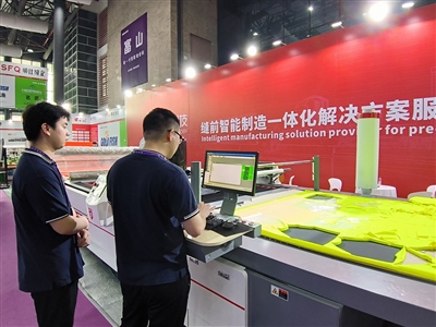 智能智造馆里的参展商除了本土企业外,还有不少来自省内外的企业。元一科技来自广东中山,是一家专注于高精度裁剪系统的公司,是缝前智能制造一体化解决方案服务商。