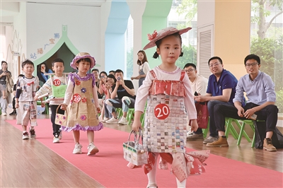 可爱的公主裙、酷炫的“职业装”“穿越”的仿古服……伴随着动感的音乐,身着各式服饰的小模特们分组走上“红毯”,有模有样的“猫步”、别具特色的造型,引来观看的家长、老师和小朋友们阵阵掌声。