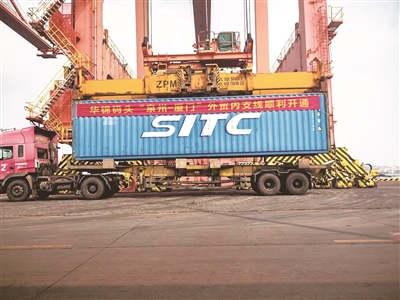 本报讯 4月12日,“方舟21”轮顺利靠泊华锦港1号泊位并进行首批外贸箱吊装作业,标志着华锦港“泉州—厦门”外贸内支线正式开通,这是华锦港成功开通的首条外贸航线。