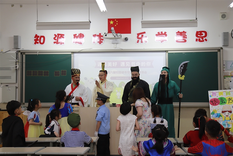 校园中,师生们通过戴头饰、穿服装等形式装扮成书中人物,使得一个个鲜活的人物从书中走了出来。他们走进校园和同学们惊喜相遇,分享自己的读书故事和读书心得。