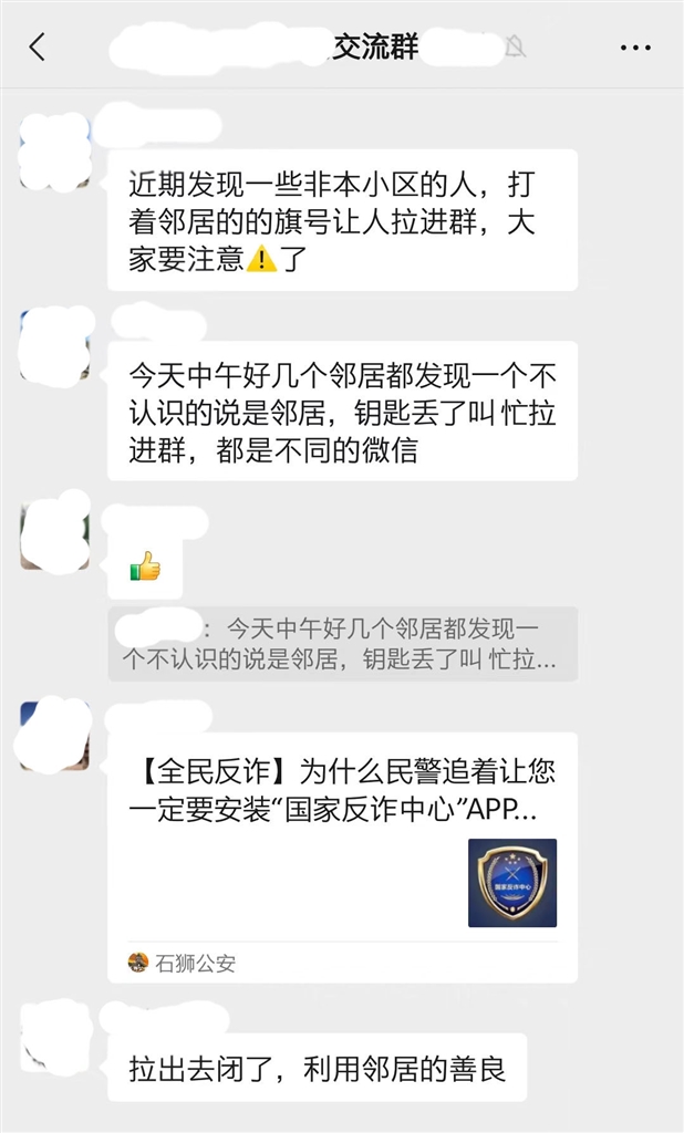 近日,市民王女士手机收到一个陌生人冒充小区业主请求帮忙拉入小区业主群的信息。对方先是添加王女士微信,自称是同一小区邻居,因钥匙掉了想让王女士帮忙拉入小区业主群问问有没有人捡到。刚好王女士看到业主群里有较高警惕的邻居发布的提醒:近期好几个邻居都收到帮忙拉入业主群的信息请求,请大家提高警惕,防止非本小区的人混入业主群里行骗。王女士差点被骗,就赶紧将此人拉黑,并在小区业主群里也提醒大家小心不要被骗。