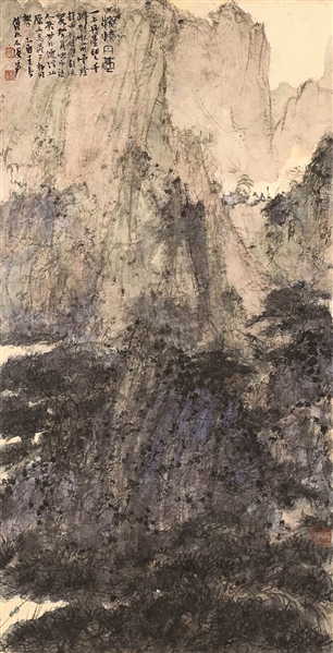 石涛的画迹中曾有一册《黄山八胜册》,其中便有对炼丹台的描绘与诗意吟咏。傅抱石并未拘泥于原画的图像,而是从诗意中汲取灵感,创作出这幅独具特色的《黄山炼丹台》。画面中,巨岩层叠,奇峰迭起,密树繁茂,展现出了黄山炼丹台的雄伟与壮丽。画家巧妙地运用“抱石皴”技法,使得岩层与密树相缠纠结,连绵交织,形成一幅浑然一体的画面。