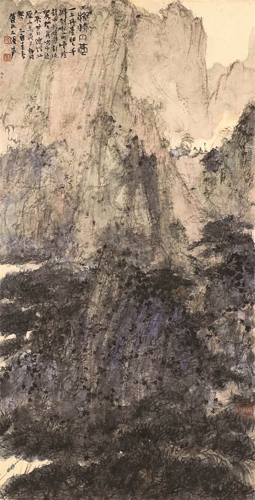 这幅《雁荡山图》作于1973年,此时的李可染经历了特殊的历史时期后,重拾画笔,创作了一批与以往风格迥异的作品。他的笔墨变化更加丰富自然,意境更加空灵虚静,艺术进入一个新的创作高峰期。画中的岩壑壁立,以近乎垂直的线条勾勒而出,再加以干笔或渴笔肆意皴擦,使得岩壁的阴阳向背、沟壑纵横跃然纸上。山谷中的树木笔直生长,与岩壁走势相呼应,共同营造出一种垂直的险峻之势。然而,画家并未一味追求垂直造势,而是在刻画近景山石时,采用回旋勾法并加大力干皴,既精妙地表现出山石的肌理走势,又巧妙地打破左侧山石和烟树造成的垂直险势的单调感,使得画面层次更为丰富,险峻中更显雄奇与震撼。