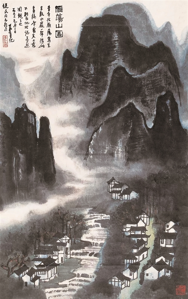 画面采用全景式布局,构图饱满,境界开阔。山峦以浓重的笔墨写成,山体浑厚,轮廓清晰。远山、云雾与河流形成的S形曲线,在雄奇的山水中增添了一种优美的变化。近处的村舍与溪流,以明亮的反光与黑山、黑瓦形成鲜明对比,更显其光洁耀眼。这种重墨和光效的运用,是李可染中后期山水的典型特征,此幅作品运用得尤为出色,既展现了画家对雁荡山水的感性印象,又以鲜明的形式感表现了自然山川的律动。