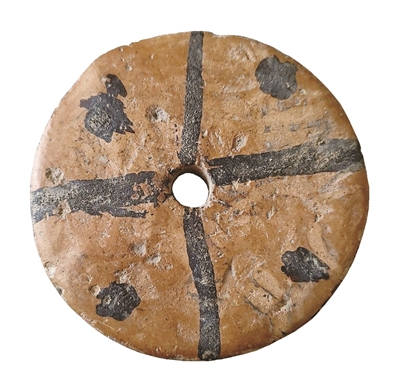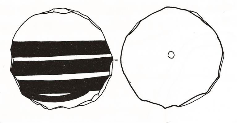 另外烧制陶纺轮不易,菜园古人也非常勤俭节约,将破碎的陶罐的陶片磨制纺轮来使用。在菜园新石器遗址发掘出土过此类型的陶纺轮(图1)。据《宁夏菜园》一书第9页记载:“陶纺轮坯,2件。圆饼形,皆用破碎泥质橙黄陶片琢成,未经修磨。孔未钻穿。标本MH4:1,背面饰黑彩条带状纹。直径6.2、厚0.4、孔径1.4厘米。”