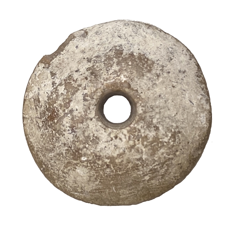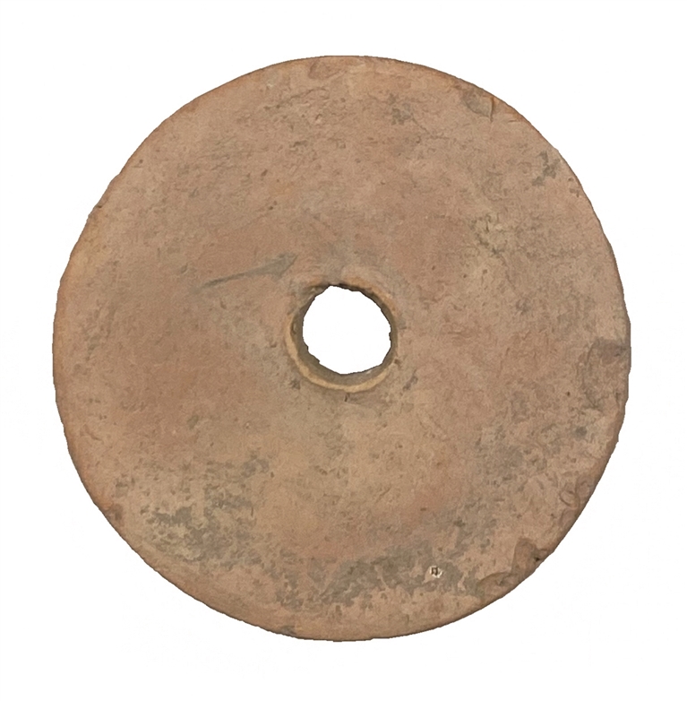 红陶纺轮(图2),泥质红陶,圆饼状,直径6.5厘米,素面,薄厚均匀一致。
