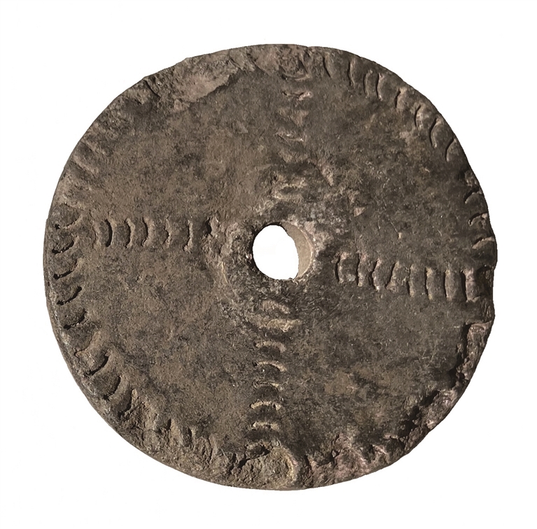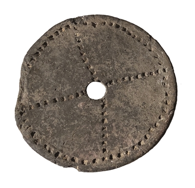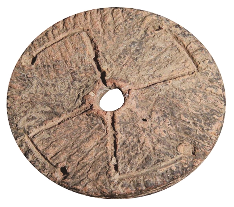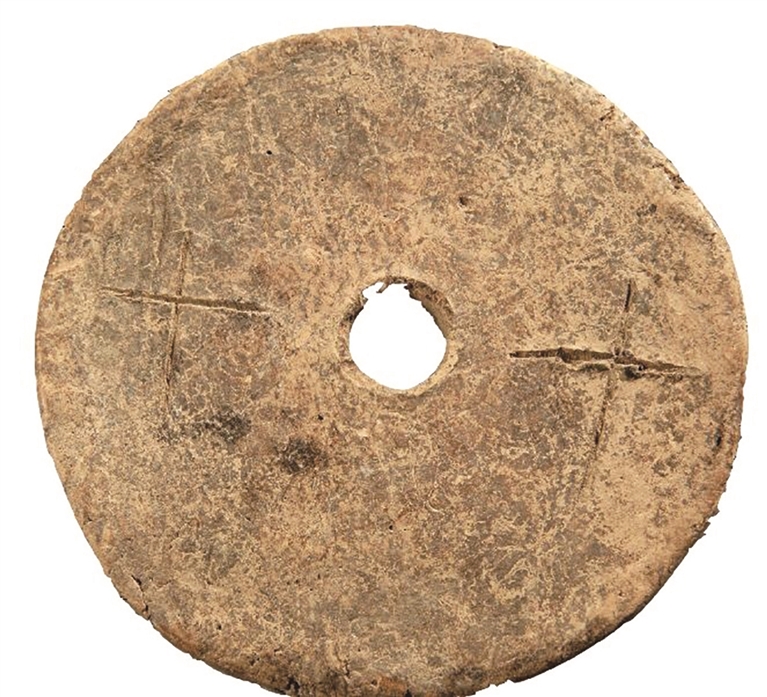 指甲⊕字纹灰陶纺轮(图9),泥质灰陶,圆饼状,直径6.2、厚1、孔径0.6厘米,表面光滑,用指甲戳⊕字纹饰。