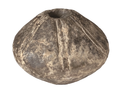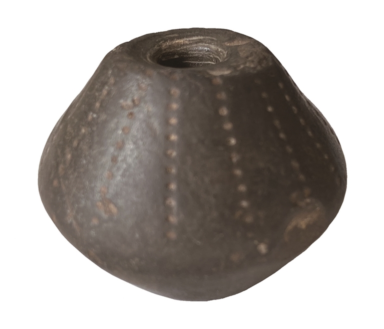 灰陶柱状菱形纺坠轮(图10),泥质灰陶塑成,柱状菱形,高3、腹径3.8厘米,器表戳有圆点条状垂帘纹,中间有孔,可插旋杆。