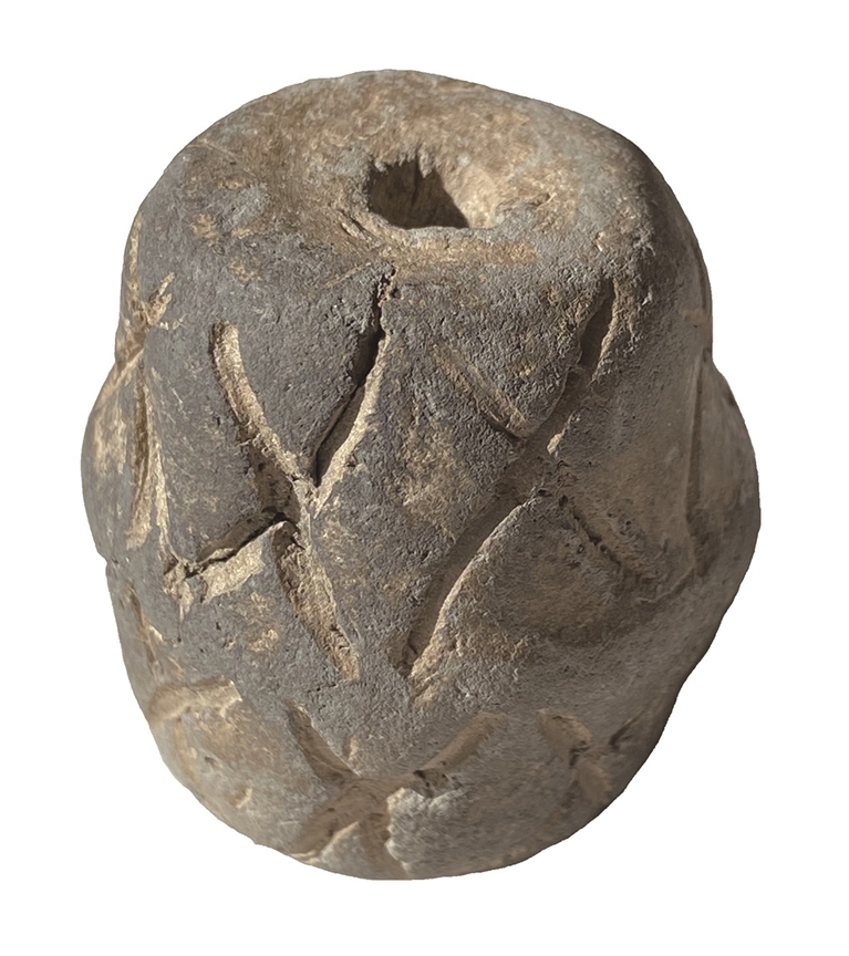 柱形纺坠轮(图12),泥质灰陶塑成,柱状,高3.5、腹径3.5厘米,表面刻画“×”字纹上下各一周,中间有竖直孔,可插旋杆,可用来纺线。