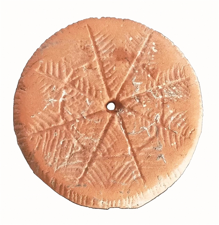 十字纹红陶纺轮(图3),泥质红陶,圆饼状,直径6.6、厚1厘米,底部平面,表面对称刻画十字纹,边缘微薄。
