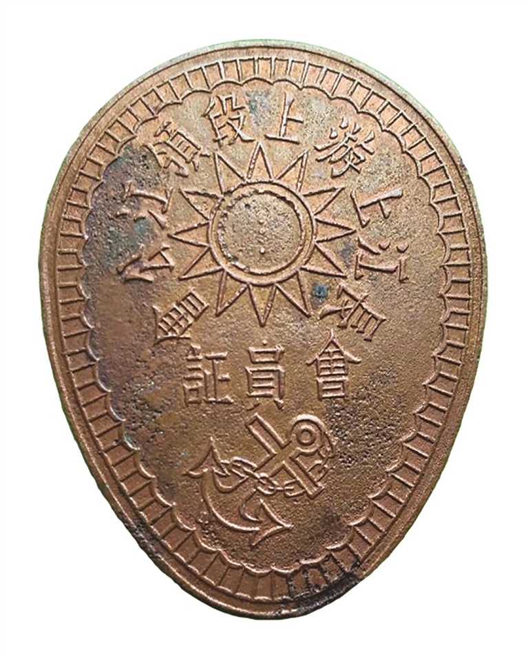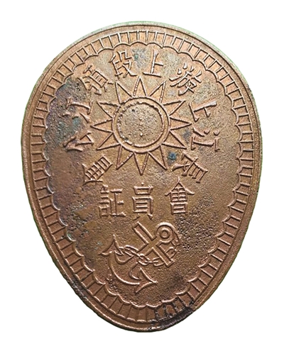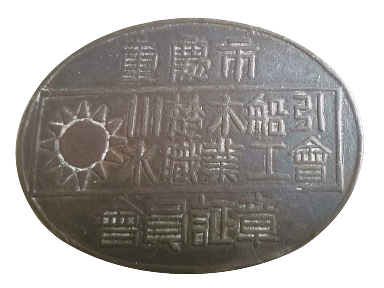 图1为重庆市长江上游上段领江公会会员证章,铜质,尺寸3.4×2.6厘米,背面戳印“渝白象街民生金属工业社造”。图2为重庆市川楚木船引水职业工会会员证章,铜质,椭圆形,规格3.5×2.2厘米,背面三位数字编号。图3为中华海员湘鄂引水工会证章,铜质,背面戳印“文华造”。图4为中华海员工会直属湘桂引水支部会员证章,外形为船舵,中间“V”字图形上镌主题铭文,象征“胜利”,此为抗战胜利后制作。
