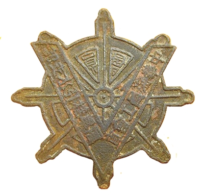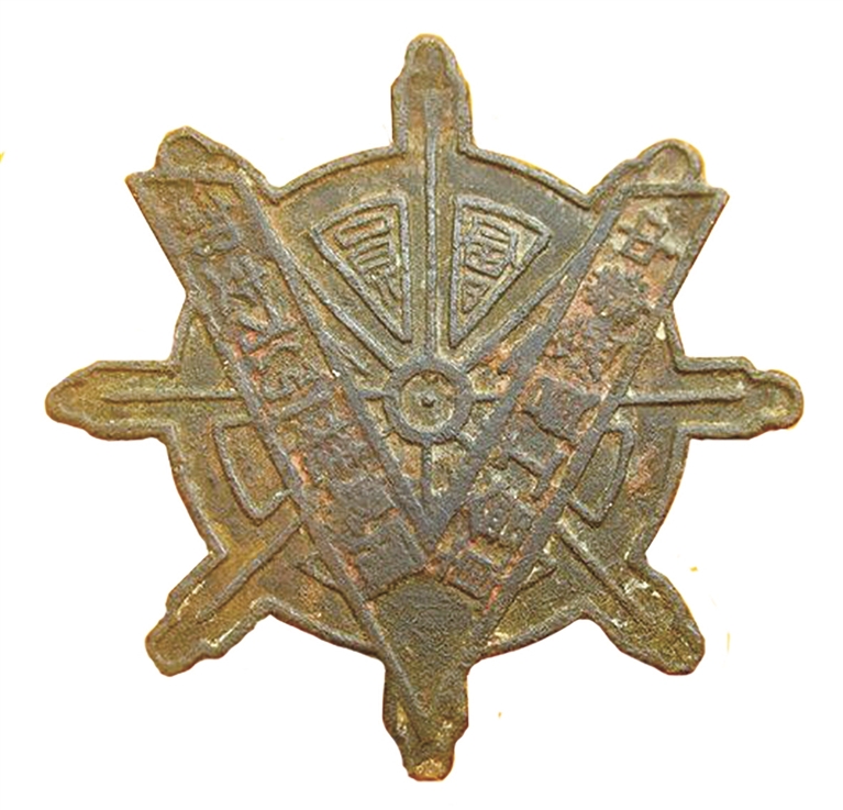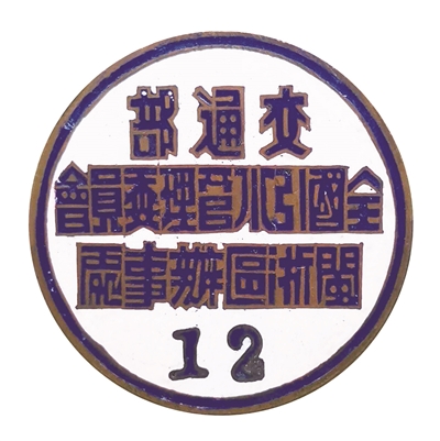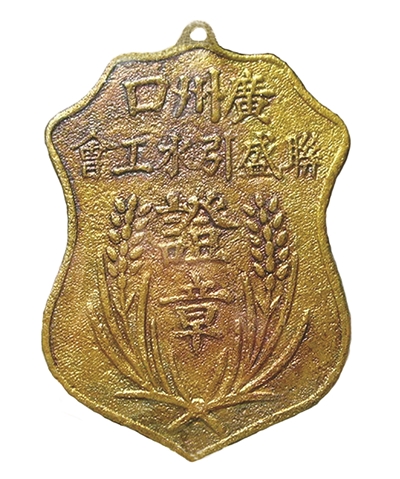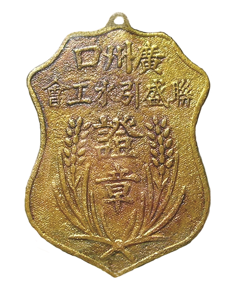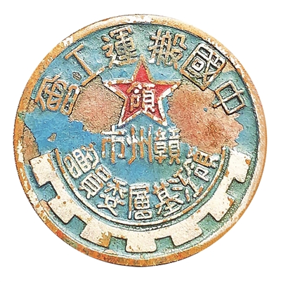 图9为中国搬运工会赣州市领江基层委员会证章,铜质,直径2.8厘米,背面两位数字编号,新中国成立后制发。