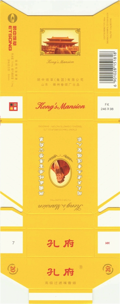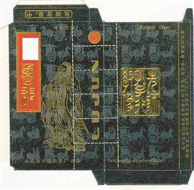 被尊为“至圣先师”的孔子是中国历史上最伟大的教育家。孔子形象曾出现在山东多家烟草企业出品的烟标上。如山东兖州雪茄烟厂出品于20世纪80年代的“鲁郡”烟标(图1),于黛青色古代车马和单人骑骏马底图上,主版是一幅金色线描孔子行礼图,副版是一枚刻有“先师孔子行礼像”的金色阳文印章,侧面印有关于孔子的简要介绍:“孔子是我国春秋末期著名的思想家、政治家、教育家和儒学的创始者,被中国封建社会尊为‘圣人’。”此后的90年代,山东滕州卷烟厂的“孔府”烟标(图2),副版在孔子肖像两边印有“与国咸休安富尊荣公府第 同天并老文章道德圣人家”联语。这副至今仍悬挂在孔府大门两侧的“富贵无头”对联,表达了对孔子世家富贵荣华的祝福和对圣人文章道德的崇敬之情。