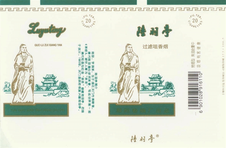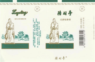 我国是茶的故乡,也是茶文化发源地。喝茶喝出学问的则莫过于茶文化鼻祖陆羽。20世纪90年代,湖北郧阳卷烟厂出品的“陆羽亭”烟标(图10),主副版均为在陆羽亭背景衬托下,突出展示矗立于湖北天门市竟陵西湖陆羽公园内陆羽右手托茶具若有所思的全身塑像。侧标位置则印有“陆羽,字鸿渐。生于湖北天门市竟陵镇。唐代陆羽潜心研究茶事,写成世界第一部《茶经》,被世人尊为‘茶圣’。清代知县为纪念‘茶圣’修建陆羽亭,后毁于战火。1985年,天门县政府恢复兴建陆羽亭”字样。