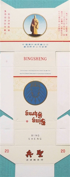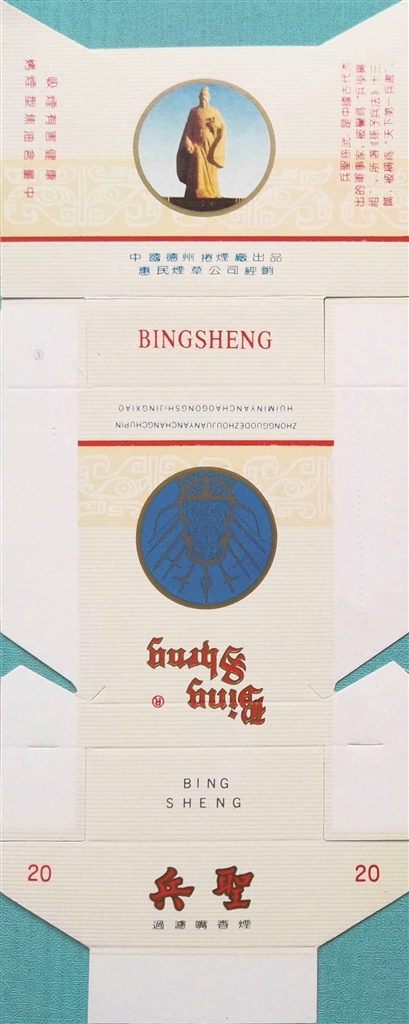 孙武,字长卿,又称孙武子、孙子,春秋末期著名军事家、军事理论家和思想家。20世纪90年代,中国德州卷烟厂出品的“兵圣”烟标(图3),该标主版是位于山东惠民县孙子故园内的高达8米、重30多吨的花岗岩孙武雕像,副版则是盾牌以及刀枪剑戟弓等冷兵器。