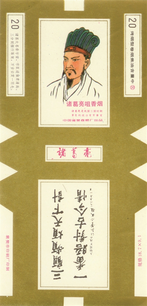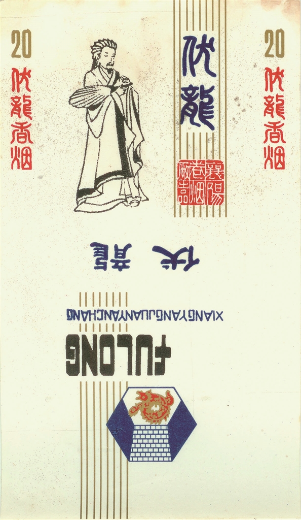 诸葛亮(181—234),字孔明,号卧龙,徐州琅琊阳都(今山东临沂市沂南县)人,三国时期蜀汉丞相,杰出的政治家、军事家、散文家、书法家、音乐家、发明家,世称“智圣”。诸葛亮青年时耕读于荆州襄阳城郊,地方上称其卧龙、卧龙先生。受刘备三顾茅庐邀请出仕,随刘备转战四方,建立蜀汉政权,官封丞相。因其死后追谥忠武侯,故后世常以武侯、诸葛武侯尊称诸葛亮。其散文代表作有《出师表》《诫子书》等。曾发明木牛流马、八阵图、孔明灯、孔明锁等,并改造连弩,叫做诸葛连弩,可一弩十矢俱发。20世纪80年代,中国襄樊卷烟厂出品的“诸葛亮”烟标(图5),主版为诸葛亮肖像以及简要介绍文字,左侧标印有杜甫《咏怀古迹之五》七律的前四句。副版是董必武于1965年1月游览武侯祠题写、现在悬挂于四川成都武侯祠的楹联“三顾频烦天下计,一番晤对古今情”。诸葛亮与当时的谋略家、军事家庞士元被人美誉为“伏龙凤雏”,襄阳卷烟厂出品于同期的“伏龙”烟标(图6),主版是诸葛亮手持鹅毛扇的形象。
