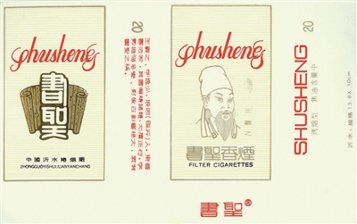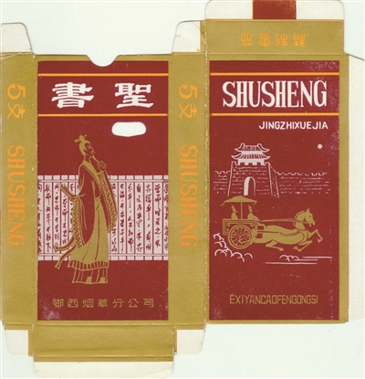 我国古代对人格最高尚、智慧最高超的人,赋予一个“圣”字,像国人崇拜的文圣孔子、兵圣孙武、医圣张仲景、智圣诸葛亮、书圣王羲之、武圣关羽、茶圣陆羽、诗圣杜甫等,就是我国古代各个领域造诣深厚的领军人物。国产烟草企业也不时把他们“请”上烟标,借以宣传他们为推动社会进步、文化发展作出的杰出贡献。