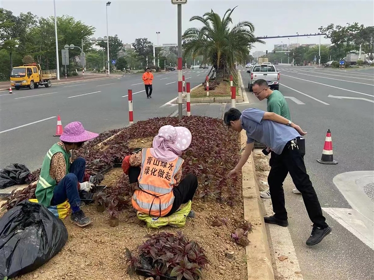 近日,记者在一处种植现场看到,园林养护工人熟练地平整种植区域,随后开始花苗移栽工作。一阵忙碌过后,整片区域很快被几种色彩搭配的花朵覆盖,绽放出迷人的光彩。