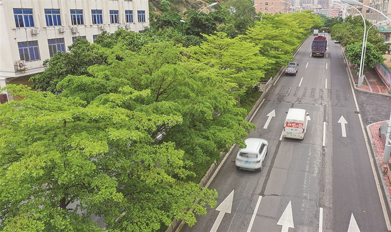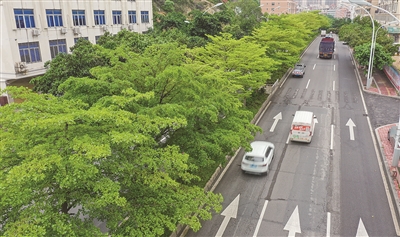 本报讯 四月的大地一片绿意盎然,4月27日,记者在我市南环路隔离带上看到,一排小叶榄仁树已长出绿绿的嫩芽,树叶像雨伞一样撑开如同一道绿色屏障,行驶车辆穿梭其中仿佛“绿中行”,成为我市一道亮丽的风景线。据了解,南环路种植的小叶榄仁树已有好几年,主干浑圆挺直,高数米,树冠呈伞形,层次分明,树形优美,可抗强风吹袭,适应性极强。 (记者 颜华杰)