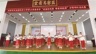 《江南》《千字文》《念奴娇·赤壁怀古》……坑东小学以班级为单位,每班选送一个节目,或是歌舞,或是情景剧,既诵又演,将一首首古诗词的魅力呈现出来。据悉,古诗词吟诵活动是坑东小学坚持多年的一项传统活动,今年的主题是“诵读传经典 诗意满校园”。该校开展这一活动,旨在将传统文化根植于学生心中,激发同学们的学习、积累古诗词的兴趣,提高审美情趣,增强文化底蕴,营造浓郁的读书氛围。