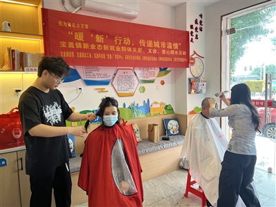 据悉,此次关爱行动是宝盖镇团委五四青年节系列活动之一。活动现场,石狮市美发美容协会的两位爱心理发师,为宝盖辖区的快递小哥、环卫工人、企业职工等提供“私人定制”服务。伴随“咔嚓、咔嚓”的清脆响声,接受服务的对象原本凌乱的头发变得整齐利落,显得精神了。送来关爱的还有石狮市食品行业协会。为了向炎炎烈日下为石狮城市环境卫生默默奉献的城市“美容师”致以亲切的慰问,市食品行业协会开启“公益一瓶水”计划,向宝盖科技园暖心驿站捐赠20箱矿泉水,为包括环卫工人、快递外卖人员、民工兄弟、网约车司机、路面执勤警辅人员、城管人员等户外劳动者送上一份清凉。
