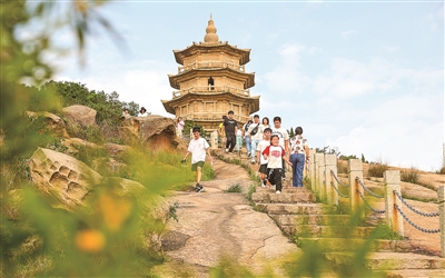 本报讯 昨日是“五一”假期第三天,加上天气晴好,市民游客出游热情高涨,爬爬宝盖山,游玩十里黄金海岸……我市主要景区、景点迎来客流高峰。记者在宝盖山风景区看到,不少游客携家带口上山游览,享受惬意的“五一”假期。