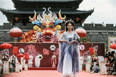 5月2日,在严州古城的城门前,演员身着传统服饰参加宋韵服饰展示活动。