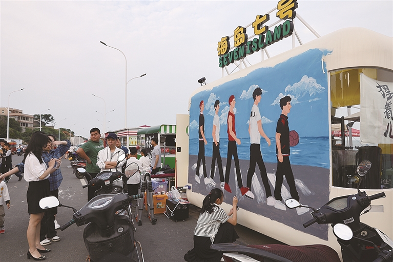 “五一”假期,祥芝镇东大垵“小威海”景区人潮涌动,记者昨日在现场看到,不少餐车在车身上进行趣味涂鸦,引来排队拍照的游客,让原来热闹的“十里东大垵”更添活力。 (记者 王文豪 李荣鑫)