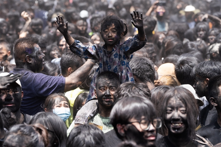 5月3日,云南省墨江哈尼族自治县举行第十八届墨江北回归线国际双胞胎节暨哈尼太阳节“抹黑脸”民俗活动,当地群众与来自各地的游客通过互相抹黑脸送祝福。“抹黑脸”是墨江当地的一种习俗,寄托美好祝愿。(新华)
