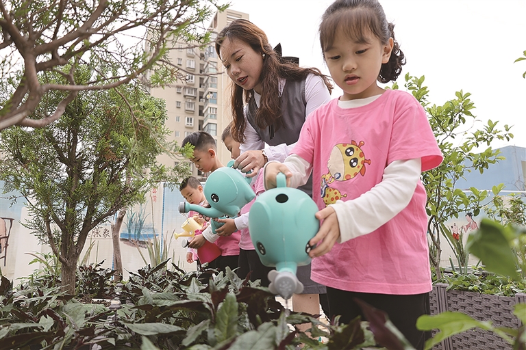 9时,随着早晨的阳光洒满校园,黄晓琳和蔡凉凉两位老师带领孩子们来到位于五楼露台的“百草园”。这是一个集教育与实践于一体的中草药种植基地,种植着艾草、薄荷、风葱等20多种常见中草药。孩子们在老师的指导下,小心翼翼地给草药浇水,拔除杂草,并仔细观察着每一株草药的生长情况。