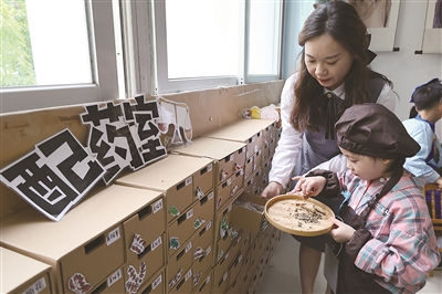 10时,参观完“百草园”后,孩子们在两位老师的带领下来到三楼的“中医药文化一条街”。这里设置了中药馆、药膳堂、百草学堂、药材加工厂等小主题的室内自主游戏区域。