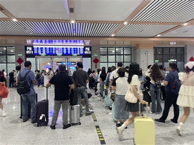 本报讯 “五一”小长假即将结束,泉州南站迎来返程客流小高峰。5月5日下午,记者在泉州南站看到旅客正带着行李排队接受安检。当前正值返程高峰,铁路客流量较大,市内公共道路交通压力增加,请广大市民合理安排行程,尽可能错峰出行,预留充足时间进站乘车,具体列车开行情况,可留意车站公告,或通过铁路12306平台查询。