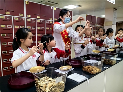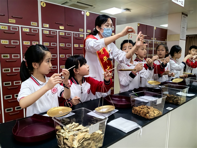 “把食指、中指、无名指和小指并拢,以中指中节横纹处为准,四指宽度即为3寸……我们一起找下足三里穴。”在石狮市中医院综合楼一楼大厅,中医师姚振汉正在为学生讲解人体穴位,学生一会比画手指,一会脱鞋脱袜子,认识自身穴位。在共享中药房,中医师教学生认识煎药、抓药、打包等流程。此外,了解神农尝百草、辨别中草药、学习中药调配、玩游戏等有趣环节,吸引小“粉丝”沉浸式体验中医文化。