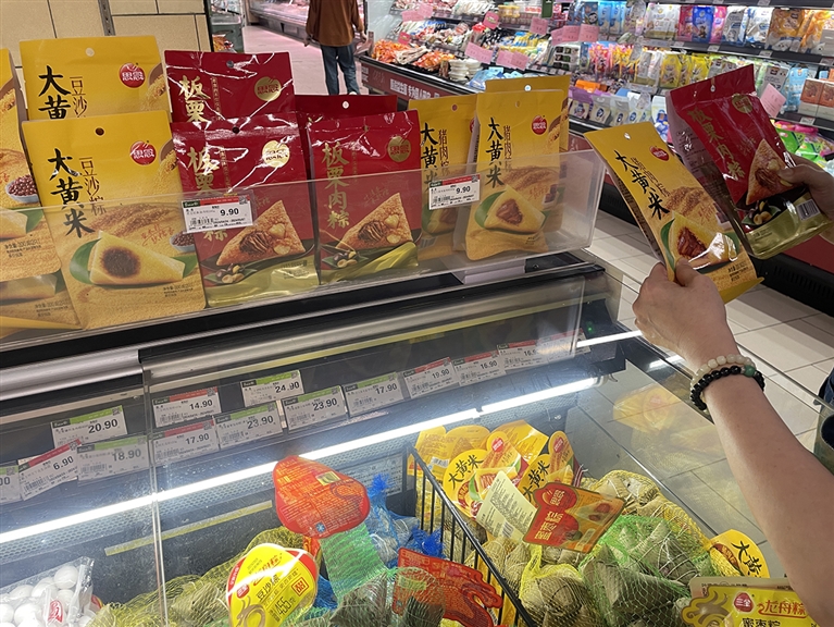 在市区某超市,笔者看到印有“端午安康”的粽子专区格外引人瞩目,专柜上各式各样的粽子有序陈列。除礼盒装外,食品加工、冷冻区域还摆放了真空包装的散装粽子,顾客可以在选购后交给工作人员加热食用,省时省力。
