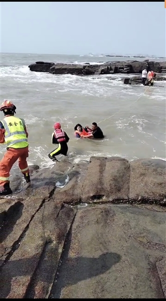 被救上岸的落水男子小蒋和小邓一脸的感激。据他们介绍,当天下午,他们驾驶车辆载着一辆摩托艇到海边冲浪,因为不熟悉潮汐,也低估了风浪的危险性,导致险情的发生。记者了解到,当天上午9时14分在洛伽寺景区也发生了一起游客被困礁石的险情,3名游客被成功转移到安全地带。