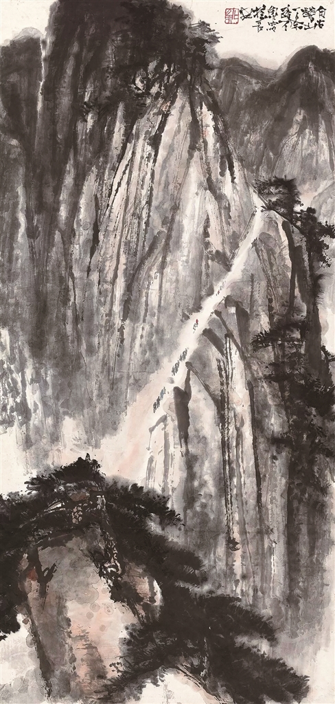 在这幅作品中,石鲁截取游人攀登华山时的一段山色进行描写。前景处,一块巨石上盘曲蜿蜒的数棵老松,与陡峭险峻的山体形成鲜明的对比。山壁陡峭如刀斩斧剁,一条窄且陡的山路依山向上,仿佛将山峰一劈为二。这种构图方式,不仅使画面中的山体显得厚重踏实,也强化了华山险要峻拔的特点。