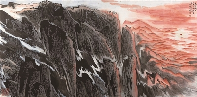 在泰山之巅,陆俨少目睹了日出的壮丽景象:破晓时分,红日从云端跃出,染红了天际的白云,逐渐点亮了四周的山峰,最终普照万物。这一幕深深烙印在他的心中,成为他日后创作的灵感之源。