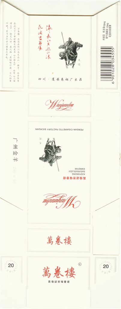 “兄玄德弟翼德擒庞德释孟德千秋智德无双,生蒲州长解州战徐州镇荆州万古神州有赫。”关羽(161—219),约生于东汉桓帝年间。据西晋时期陈寿在《三国志·关羽传》载:“关羽字云长,河东解(今山西运城市)人也,亡命奔涿郡。与先主寝则同床,恩若兄弟。而稠人广坐,侍立终日,随先主周旋,不避艰险……”20世纪90年代,四川蓬安卷烟厂出品的“万卷楼”烟标(图1),主版于红色行草书“滚滚长江东逝水,浪花淘尽英雄”右边,是一幅关羽身披盔甲,左手握缰,右手提着青龙偃月刀,身跨枣红赤兔马,一往无前冲向阵地的画面。左侧标印有“万卷楼,座(坐)落在四川南充西山。据考,西晋陈寿在此写下了举世瞩目的史书《三国志》。后有《三国演义》,脍炙人口。其人物、其韬略计谋,令人拍案叫绝!实乃当今学习借鉴之本也。”