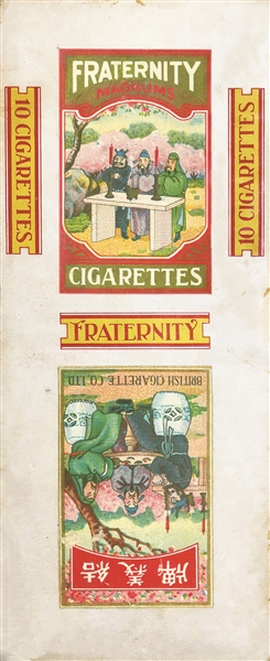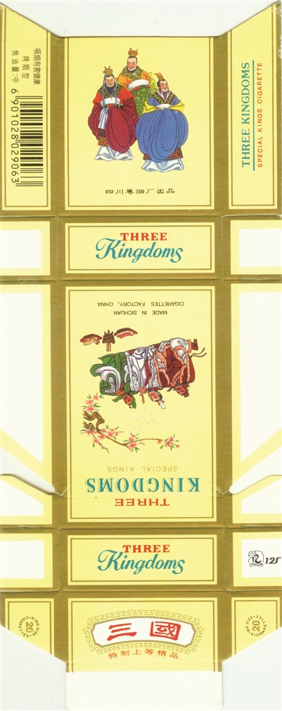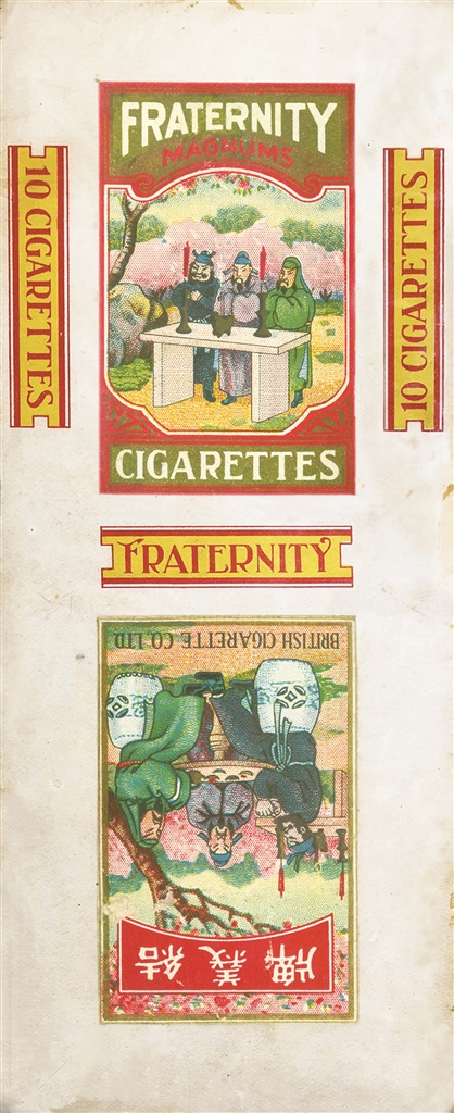 说到关羽,烟标上也不乏人们津津乐道的刘关张桃园三结义镜头。如大英烟公司出品于20世纪40年代的“结义牌”烟标(图9),主版就再现了意气相投的刘备、关羽、张飞,为共同干一番大事,在桃花绚烂的园林内,他们面对案桌燃着的香烛,对天盟誓,义结金兰的画面。此后90年代,四川、中国枣阳、中国太原、辽宁营口等卷烟厂家先后出品“三国”(图10)、“义牌”“桃园情”“三结义”烟标,主版描绘的也是刘关张在桃园结拜的画面。出品于同期的其他烟标上,也有刘关张桃园三结义的图案,只不过画面略有不同。