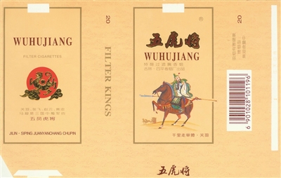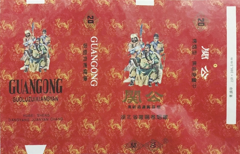 如山西太原卷烟厂出品于20世纪90年代的“关帝”烟标,主版在关羽手捋美髯,阅读《春秋》塑像的旁边,用“忠义传世”四字概括了关羽传奇的一生。中国曲沃卷烟厂出品于同期的“关帝”烟标,主版不仅有手捋美髯的画面,还印有传说是关羽的名言“愿天常生好人,愿人常行好事”。曲沃卷烟厂出品于20世纪80年代的“武圣”烟标,也有关羽英武的形象。