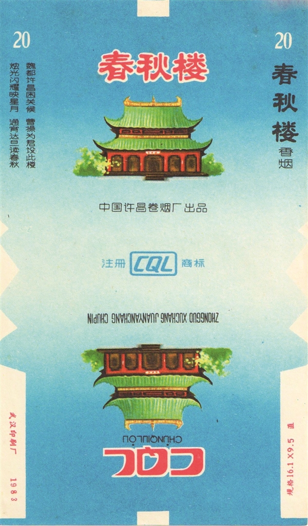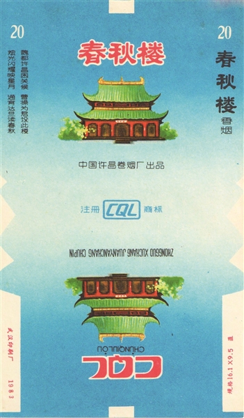 图4 中国许昌卷烟厂出品蓝底春秋楼烟标