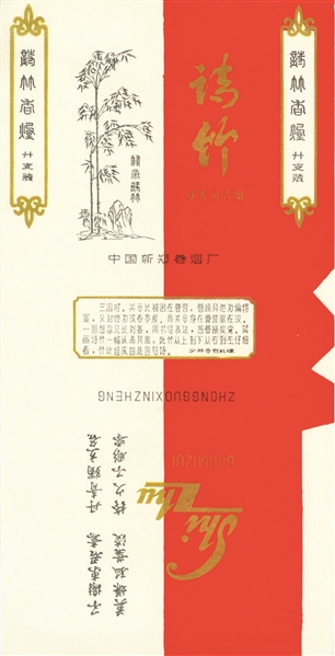 传说身在曹营心在汉的关羽被困期间,想用书信表达对兄长的想念之情,又怕曹操发觉,于是他给刘备画了一幅诗竹图。20世纪80年代,中国新郑卷烟厂出品的“诗竹”烟标(图8),主版采用的就是立于少林寺内的《关帝诗竹》图碑,此图从上到下从右到左仔细看,竹叶可以组成一首五绝,即副版所印:“不谢东君意,丹青独立名。莫嫌孤叶淡,终久不凋零。”