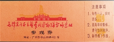 这枚毛泽东同志主办农民运动讲习所旧址参观券,纸质,长13、宽4.6厘米,画面上方是毛泽东同志主办农民运动讲习所旧址图,图下面有周恩来同志题写的“毛泽东同志主办农民运动讲习所旧址”。副券注明3项“注意事项”,即“每券一人,按时进场”“提高革命警惕,遵守馆内秩序”“副券撕下作废”。根据纸质和图文描述判断,此券应是20世纪五六十年代使用。