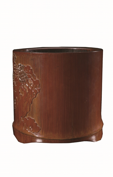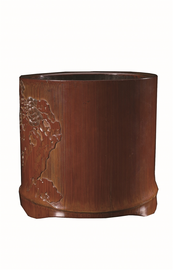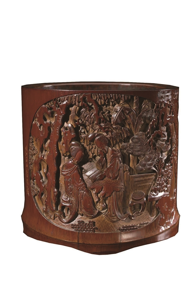 笔筒是传统文人案头的必备文具。笔筒的式样繁多,小小的器物,却蕴含着极为深远悠长的中国文人的艺术和文化意趣。因而在文房用具范畴里,笔筒有“小器大雅”的美誉。如图所示这件明末清初竹刻家沈大生深浮雕“庭园读书图”竹笔筒,口径13.1×15.5、高14.9厘米,琥珀色,光洁莹润,口、底部呈椭圆形,现藏于上海博物馆。
