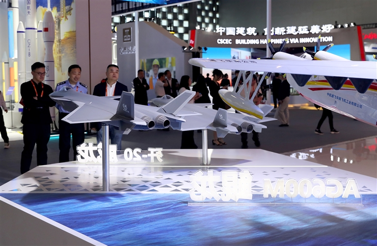 5月10日,参观者观看一组飞机模型展品