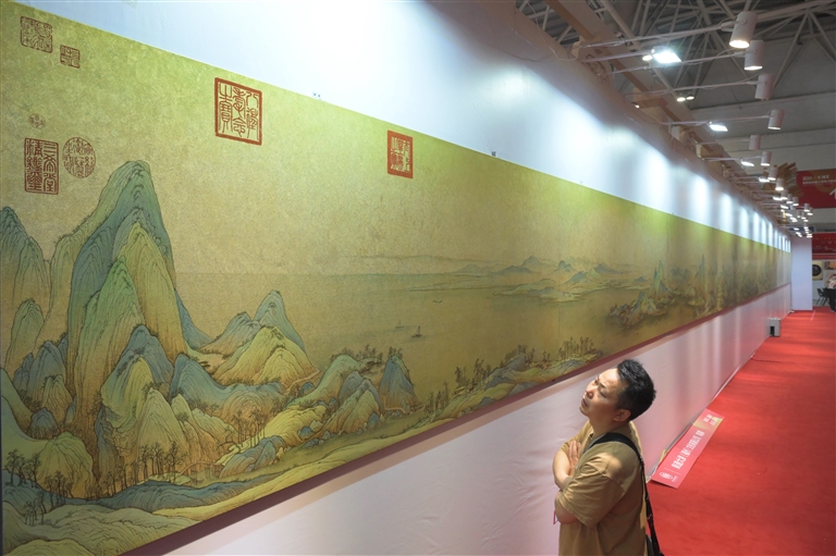 5月10日,参观者在博览会上欣赏漆画作品。