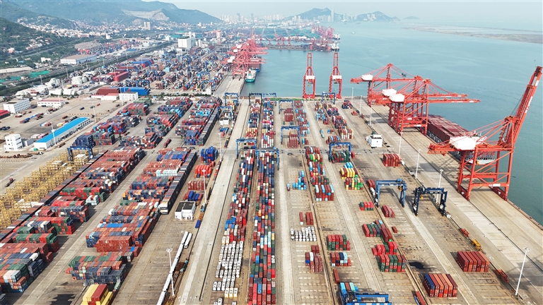 5月9日,货轮在江苏连云港港集装箱码头进行装卸作业(无人机照片)。