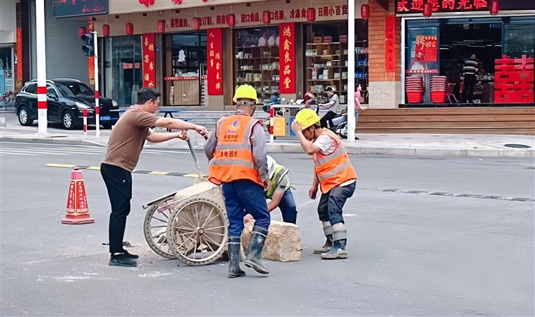 无独有偶,5月9日中午,东港路靠近宝晖路也发生一起“滴洒漏”事件。一块重达数百斤的石头突然出现在道路中央,给过往车辆带来极大的安全隐患。接到市民反映后,市园林环卫中心迅速组织工作人员前往现场处理,经过四位工作人员的合力搬运,最终顺利将石头转移。