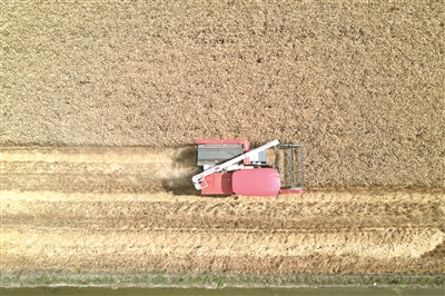 5月13日,在四川省广汉市国家现代农业产业园,收割机在收割小麦(无人机照片)。近日,四川省各地的小麦陆续进入收获期,当地农民紧抓农时,开展夏收作业,确保夏粮归仓。(新华)